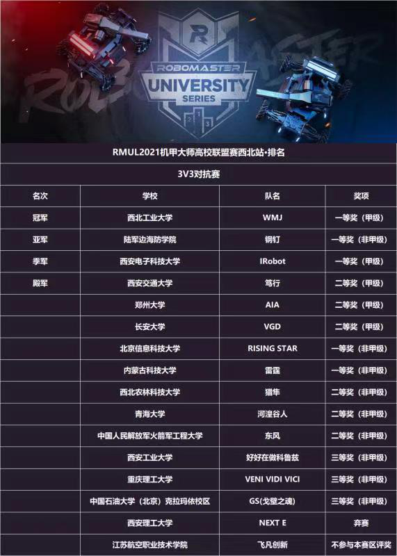 由共青团中央主办,大疆发起、西安交通大学承办的第二十届全国老员工机器人大赛RoboMasters2021机甲大师高校联盟赛(西北站),于2021年4月5日在西安市西部云谷云尚会议中心圆满落幕。赛事吸引了包含公司以及西安交通大学、西北工业大学、陆军边海防公司等众多高校参与,赛事共持续三天。公司雷霆战队过关斩将,并最终取得赛区非甲级一等奖的好成绩。