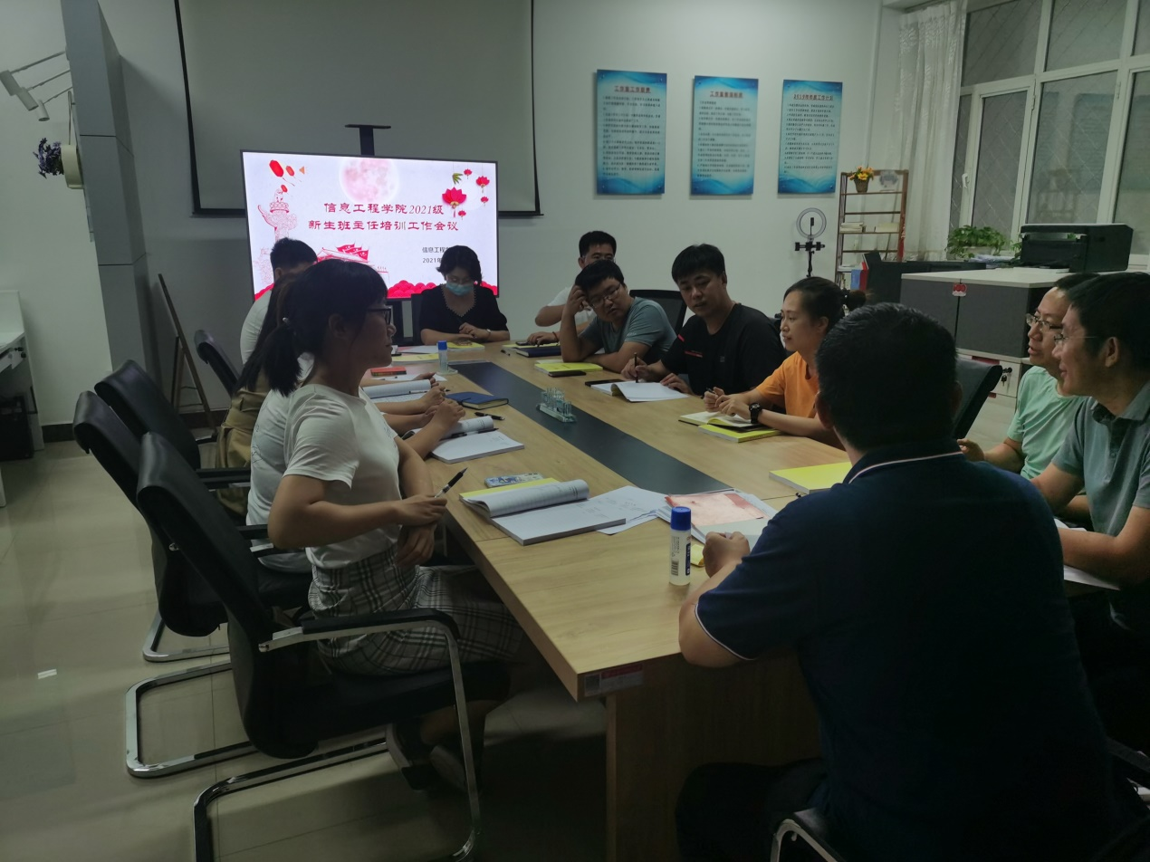 2021年7月15日下午,信息工程公司在逸夫楼D101举行2021级新生班主任培训工作会议,学工办刘吉宇老师主持会议,公司党委书记段志峰、学团办专职辅导员以及全体2021级新生班主任参加会议。