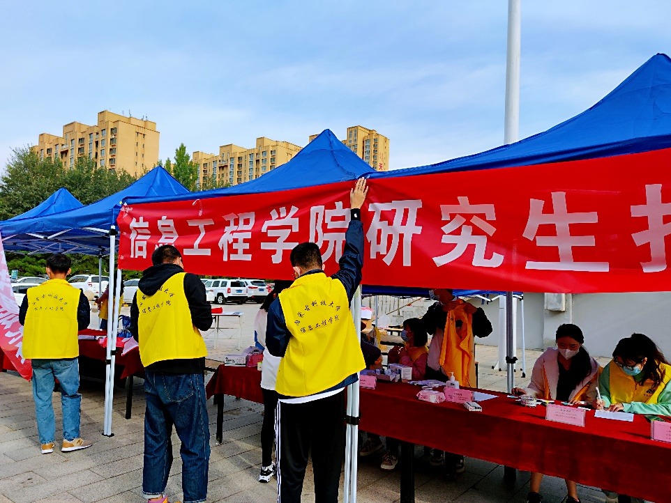 研究生首次室外迎新的挑战,研究生党支部、员工会及各级班干部有条不紊地完成了现场布置、身份核验、材料分发及整理工作。