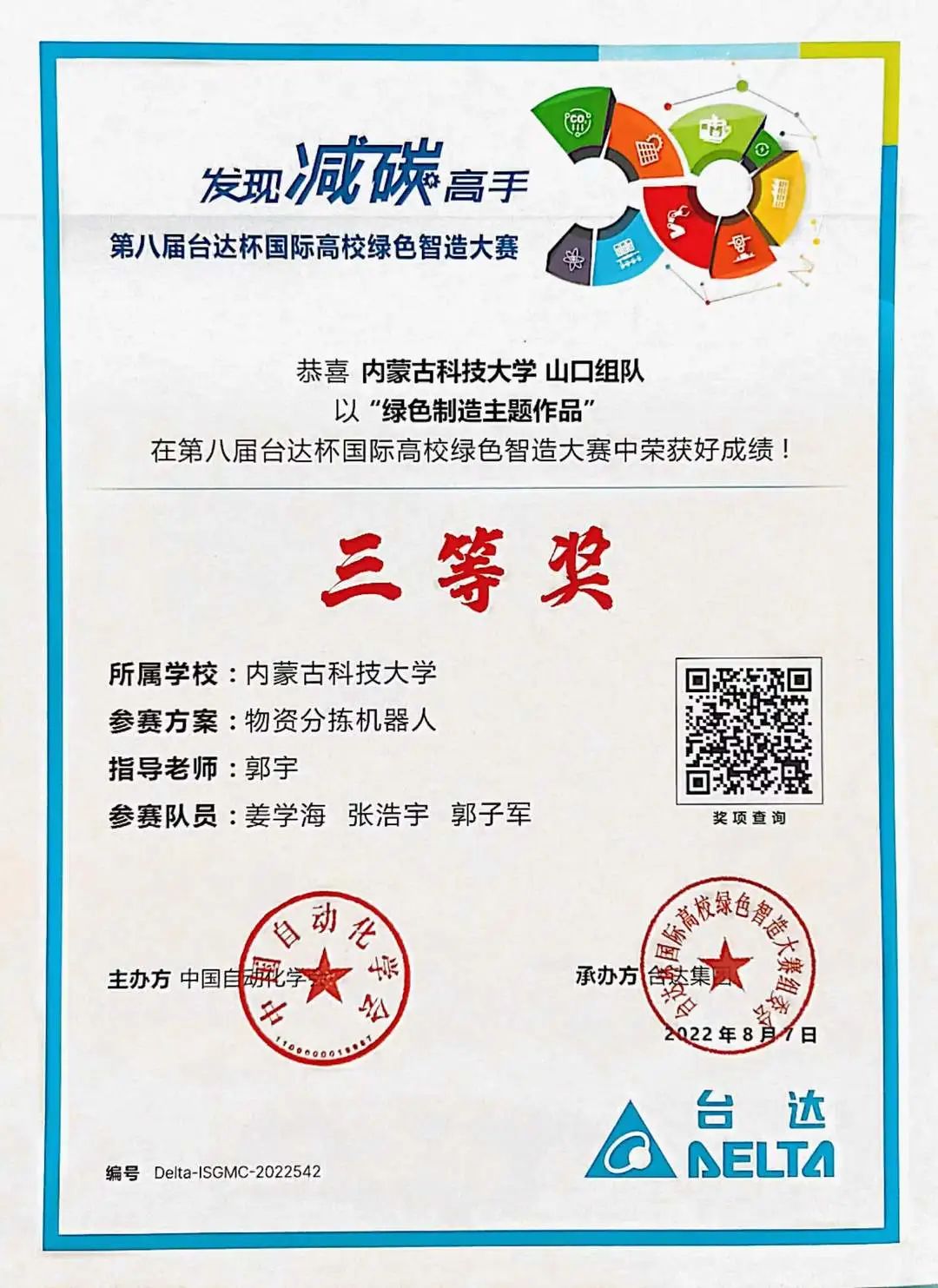 2022年8月6至7日,由中国自动化学会主办,工业与信息化职业公司产品指导委员会自动化专业指导委员会协办,台达集团承办的自动化应用领域的绿色创新型科技竞赛——第八届“台达杯”国际高校绿色智造大赛圆满落幕。由郭宇老师指导,姜学海,张浩宇,郭子军三位同学完成的作品《防疫物资智能分拣机器人》荣获全国三等奖。