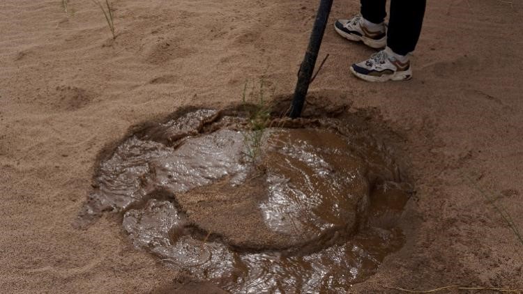 在梭梭树的养护中,浇水是十分重要的一环。实践队员们需要早早起床跟随水车进入沙漠为梭梭树苗浇水。在烈日炙烤下的沙漠,每一滴水都显得尤为珍贵。对于队员们来说,给树苗浇水是一个技术活,既要掌握阀门不浪费一滴水,又要注意距离不冲出树根。在几次尝试后,队员们终于能浇出最规范科学的水坑了。