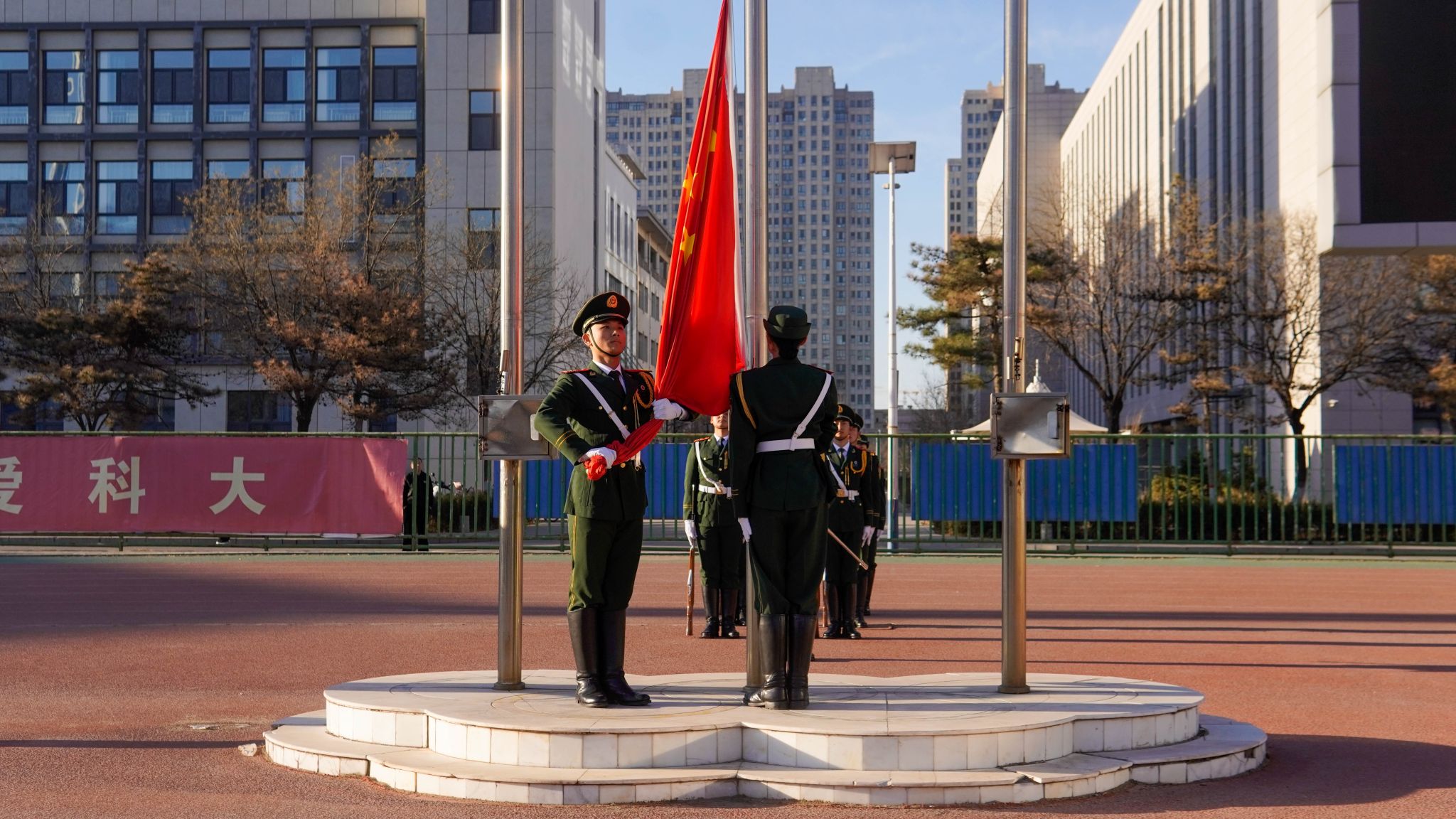 晨光熹微,启幕新章。国旗护卫队手持国旗,目光坚毅,踏着铿锵步伐护送国旗入场。升旗手振臂挥旗,伴随着《义勇军进行曲》的激昂旋律,鲜艳的五星红旗在晨光中冉冉升起,全体同学肃立行注目礼,表达着对祖国的热爱与敬意。