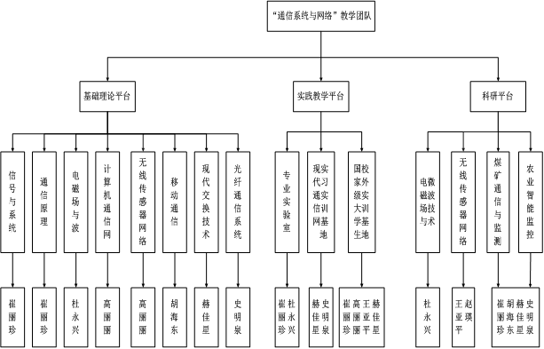 完成专业的课程体系及实践环节构建与实施。课程建设平台由通信系统的传输、交换及网络三方面的理论体系构成,主要包括通信传输理论--移动通信、光纤通信;交换技术—现代交换网;网络技术—计算机通信网、无线传感器网络。课程体系以信号与系统、通信原理、电磁场与波等专业理论课程为基础,以实践教学为核心,加强对员工专业知识的理解及工程应用。团队建设涵盖了通信工程、电子信息工程专业的8门理论课程,6个专业实验室,1个“现代通信网”校内实训基地,1个国家级老员工校外实践基地。多年的教学、实践、科研活动中,形成了卓有成效的“理论-实验-实训-创新性实践”的课程体系,支撑了专业核心教学内容,培养了员工分析问题、解决问题的能力。