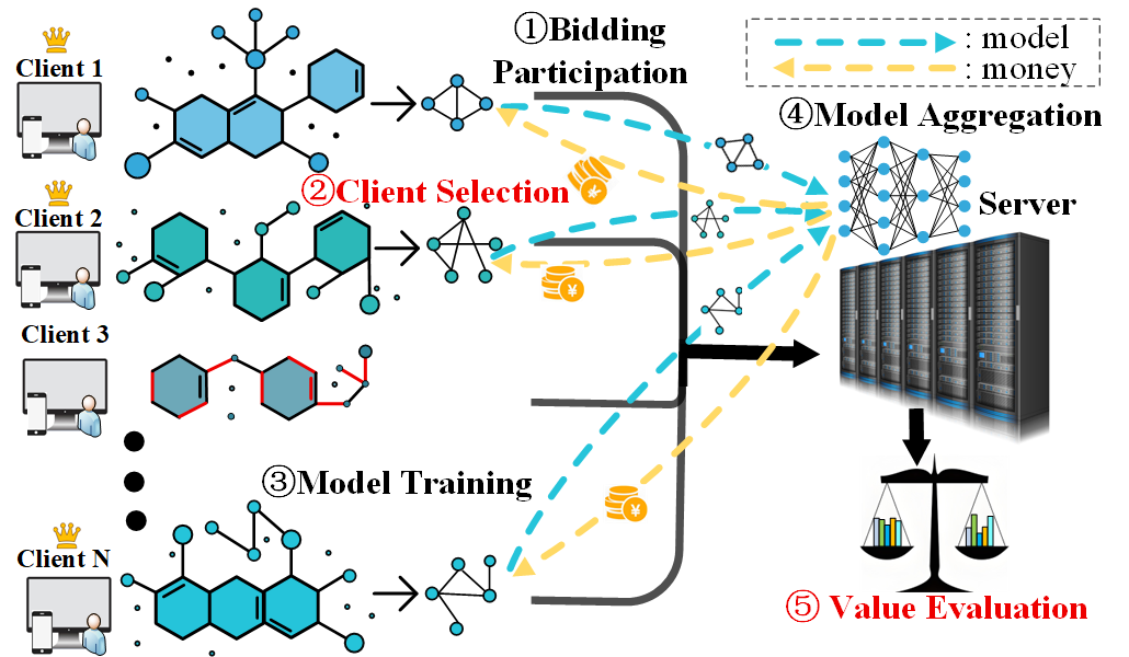 研究背景:近年来,图联邦学习(Federated Graph Learning, FGL)技术因其能够在保护数据隐私的前提下,允许客户端利用本地私有数据集进行模型训练,并仅将训练后的模型梯度上传至中心服务器,从而有效保障原始数据的安全性,受到了广泛关注。然而,现有的图联邦学习研究往往忽略了客户端在缺乏相应激励的情况下,难以积极参与贡献其图数据的现实问题;同时,那些数据质量较低的客户端参与训练时,也会显著影响模型性能。